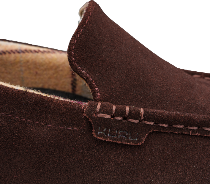 Materiales: ante, costuras de mocasín cosidas a mano, forro de franela (hombre), forro de piel de oveja sintética (mujer).